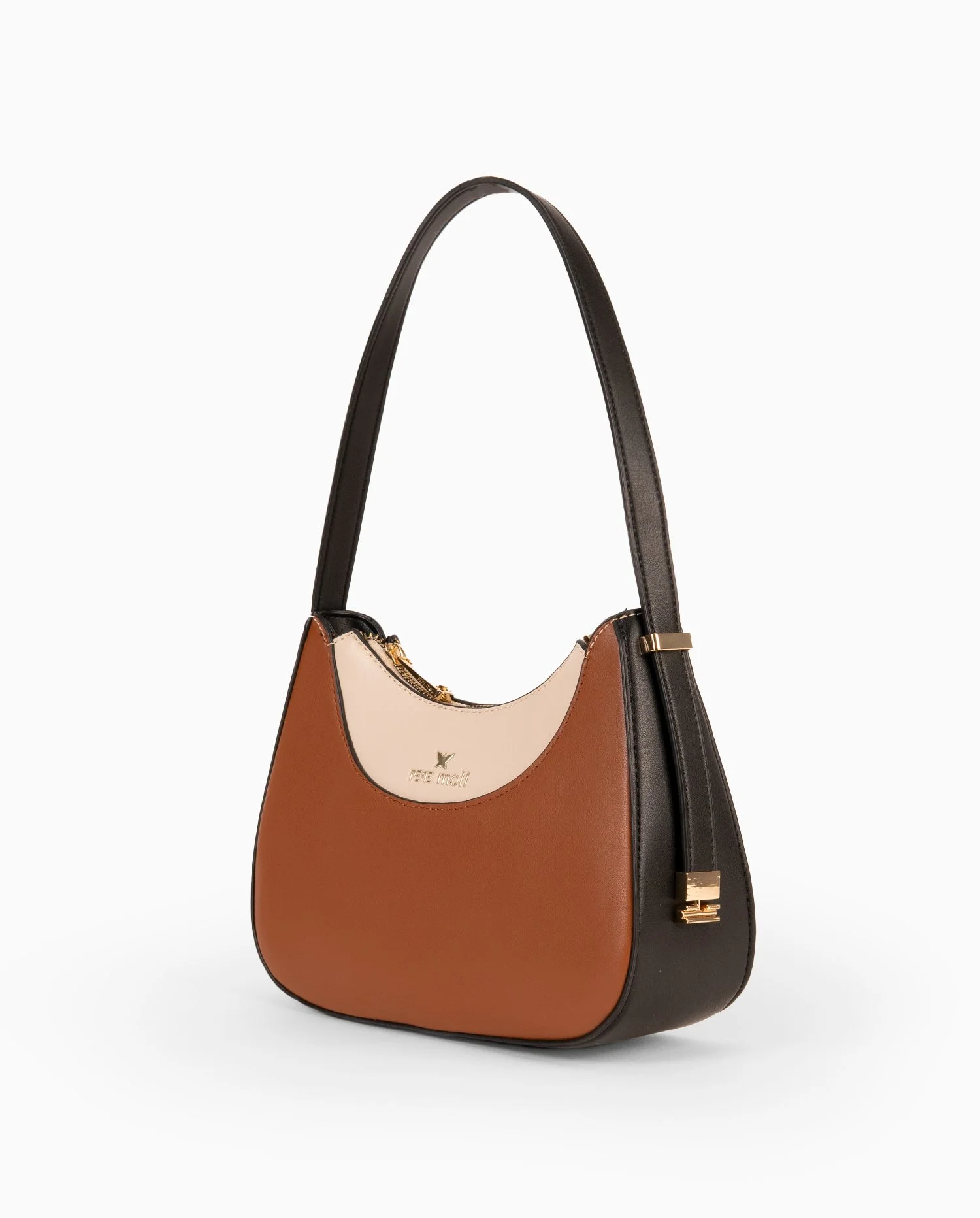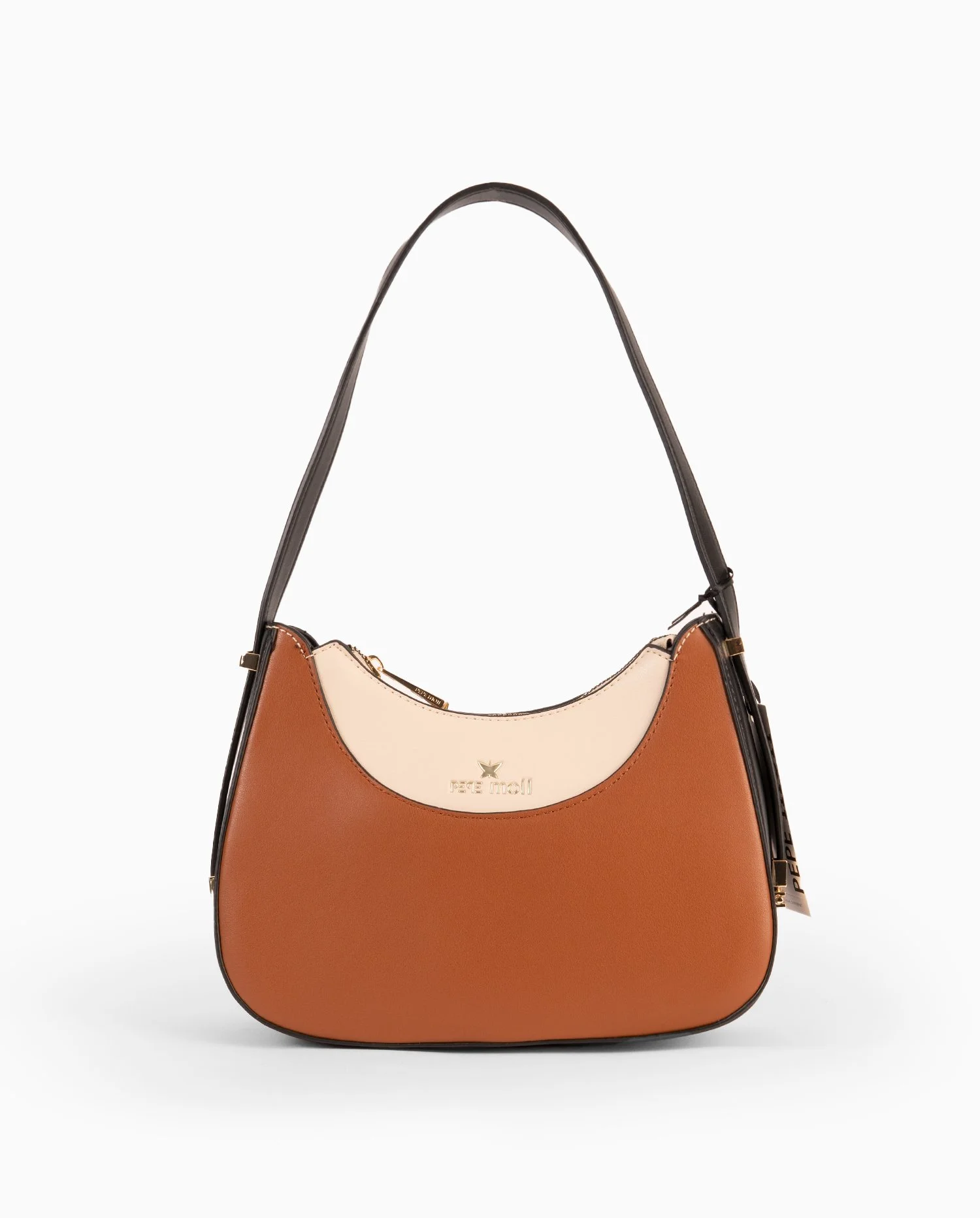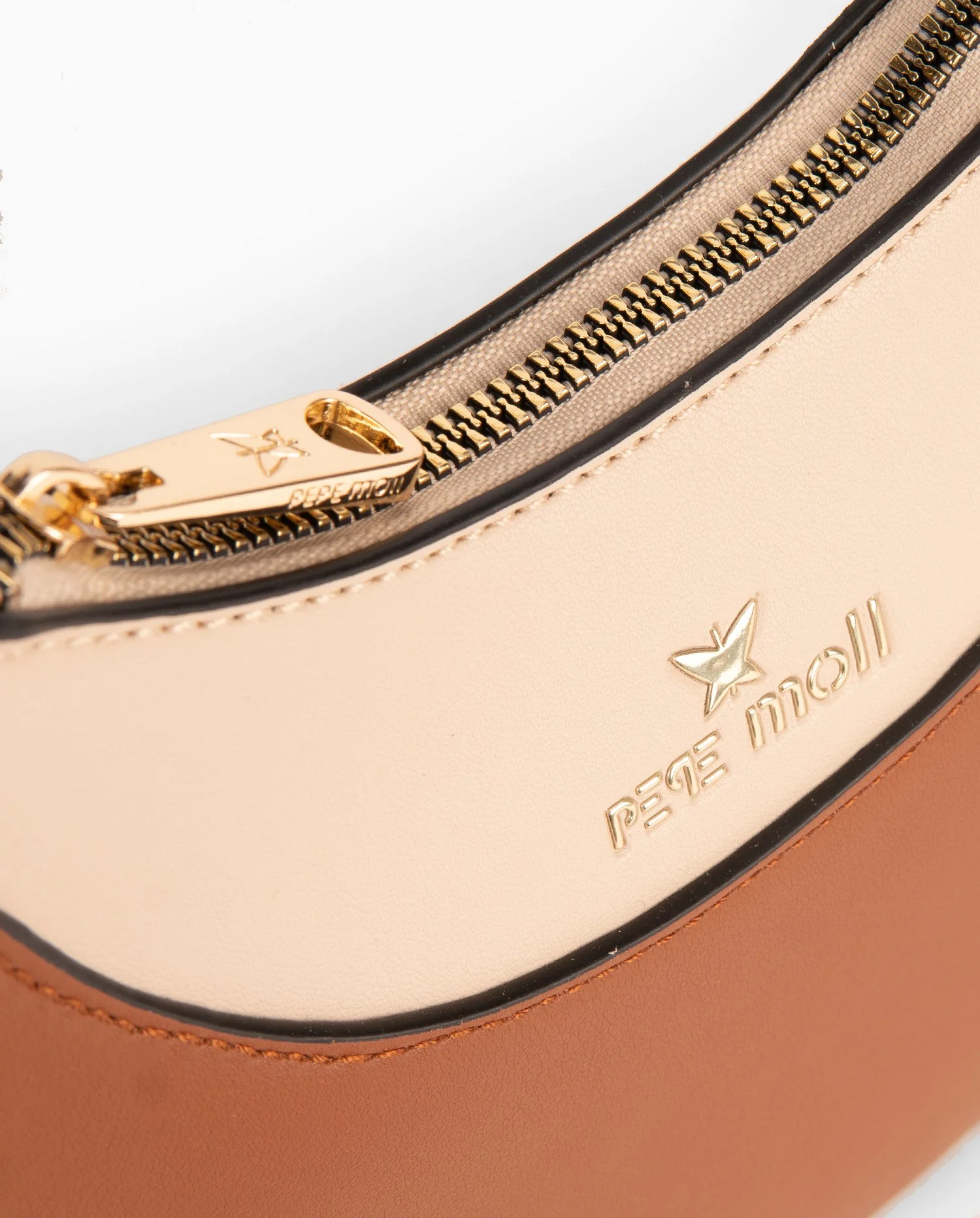 Bolso de hombro color camel combinado de Pepe Moll. Un bolso con diseño circular, que nos recuerda a esos estilismos tan destacados de las pasarelas de moda. El contraste de colores camel, crema y negro hace que sin duda lo puedas combinar con absolutamente TODO.
